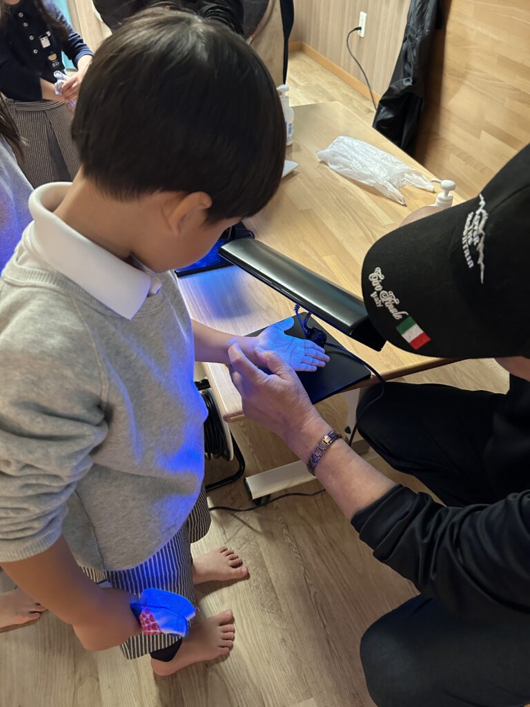 11月27日(木) こばとこどもえんのとっても元気な110名の子供たちに手洗い教室を行いました。 今回は人数も多く子供たちが集中して聞いてくれるか心配でしたが、読み手もバイキンマン、手洗いマンも変身し、めずらしい手作りの紙芝居に、子供たちは真剣な眼差しで聞き入ってくれました。その後、代表の子供たちの手に汚れに見立てたクリームをつけ、手洗いマンの教えのとおりにお歌を歌いながら手を洗ってもらいました。しかし、手洗いチェッカーでライトをあてるとまだ汚れが残っていることが分かります。もう一度洗ってきてもらうとすっかりきれいになり、子供たちはほっとした様子でした。この冬はみんなバイキンマンとバイバイできることを願っています。こどもえんの先生方もご協力ありがとうございました!